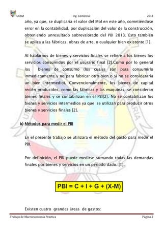 Este documento resume las principales variables macroeconómicas del Perú desde 2000 hasta 2012, incluyendo el PBI, consumo, inversión, inflación y tasa de desempleo. Explica cómo estas variables se relacionan entre sí y los factores que causaron variaciones en cada una de ellas durante este período. También incluye gráficos, funciones, coeficientes de correlación y pronósticos para analizar el comportamiento de estas variables macroeconómicas clave en la economía peruana.
