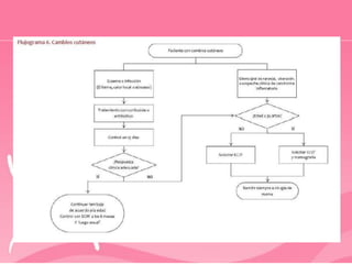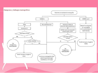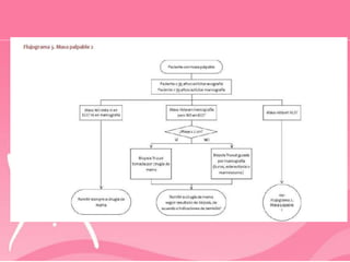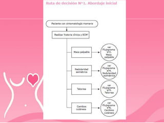 Este protocolo establece pautas para el manejo de la patología mamaria benigna. Busca estandarizar el abordaje diagnóstico y terapéutico de estas condiciones, las cuales constituyen la mayoría de las consultas por patología mamaria. Describe las pruebas de detección y diagnóstico, incluyendo el autoexamen, examen clínico, mamografía, ecografía y biopsias. También explica las condiciones patológicas más frecuentes como quistes, fibroadenomas, hiperplasia y