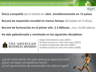 El documento presenta la compañía Agel como una empresa pionera en el mercado de complementos alimenticios en gel con un rápido crecimiento internacional. Ofrece una oportunidad de negocio como consumidor-distribuidor con bajo riesgo e ingresos potenciales a través de comisiones por volumen de ventas y un plan de compensación innovador.