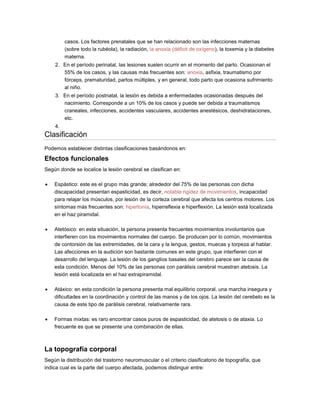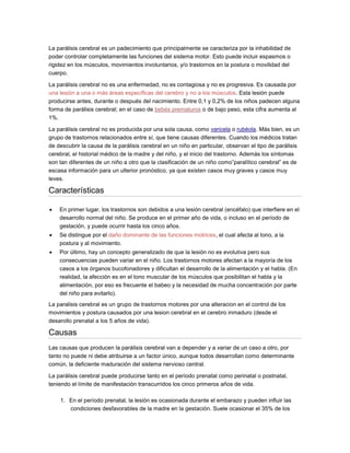 La parálisis cerebral es un grupo de trastornos motores causados por una lesión cerebral que afecta el control de los movimientos y la postura. Puede ser causada por factores prenatales, perinatales o postnatales que ocurren antes de los 5 años de edad. No tiene cura, pero el tratamiento temprano puede mejorar la movilidad y desarrollo del paciente.