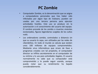 Este documento describe varios tipos de amenazas cibernéticas como PC Zombie, SPIM, Spear Phishing, Ransomware, Spam y Scam. Un PC Zombie es un computador infectado que puede ser controlado remotamente sin el conocimiento del usuario para realizar actividades ilegales. SPIM es un simulador que ejecuta programas en lenguaje de ensamblador. Spear Phishing se refiere a estafas cibernéticas mediante ingeniería social para robar información confidencial. Ransomware cifra archivos y pide rescate para desc