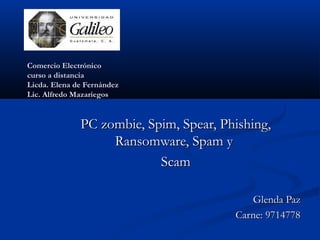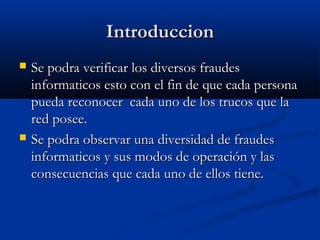 Este documento resume diferentes tipos de fraudes cibernéticos como PC zombie, Spim, Spear phishing, Phishing, Ransomware, Spam y Scam. Explica cada uno de estos términos y cómo operan, incluyendo ejemplos de cómo los estafadores usan técnicas como el envío de enlaces maliciosos o solicitudes de información personal para robar datos o pedir rescates. El objetivo es crear conciencia sobre estos riesgos para que las personas puedan reconocer estas tácticas y proteger su información.