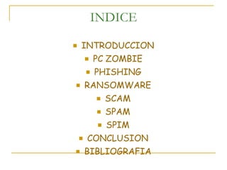 Este documento resume varios problemas de seguridad en Internet como el phishing, ransomware, scam y spam. Explica que un PC zombie es un computador infectado que puede ser controlado remotamente para enviar spam u otros ataques cibernéticos. También describe las técnicas y software utilizados en estos delitos cibernéticos y formas de protegerse. Concluye que es importante verificar la fuente de cualquier software descargado y que el spam es una forma común pero dañina de publicidad en Internet.