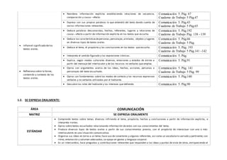 Este documento presenta las matrices de aprendizaje para el área de Comunicación en quinto grado. Incluye cuatro matrices para las habilidades de comprender textos orales, expresarse oralmente, comprender textos escritos y producir textos escritos. Cada matriz describe los estándares, capacidades, indicadores de logro y recursos educativos relacionados con cada habilidad comunicativa.