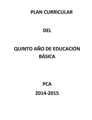 Este documento presenta el plan curricular para el quinto año de educación básica. Incluye información sobre los objetivos del desarrollo del milenio, el perfil de salida de los estudiantes de educación básica general, los ejes transversales del proceso educativo como la formación ciudadana y protección del medio ambiente, y la planificación por bloques curriculares para cada área incluyendo lengua y literatura y matemáticas.