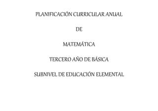 Este documento presenta el plan curricular anual de matemática para tercer año de básica. Incluye información sobre los objetivos generales y específicos, contenidos, destrezas, estrategias metodológicas y criterios de evaluación organizados en unidades didácticas. El plan se estructura en 2 unidades sobre cuidado del medio ambiente y alimentación nutritiva que abordan conceptos matemáticos como números naturales, operaciones básicas, geometría y estadística aplicados a situaciones cotidianas.