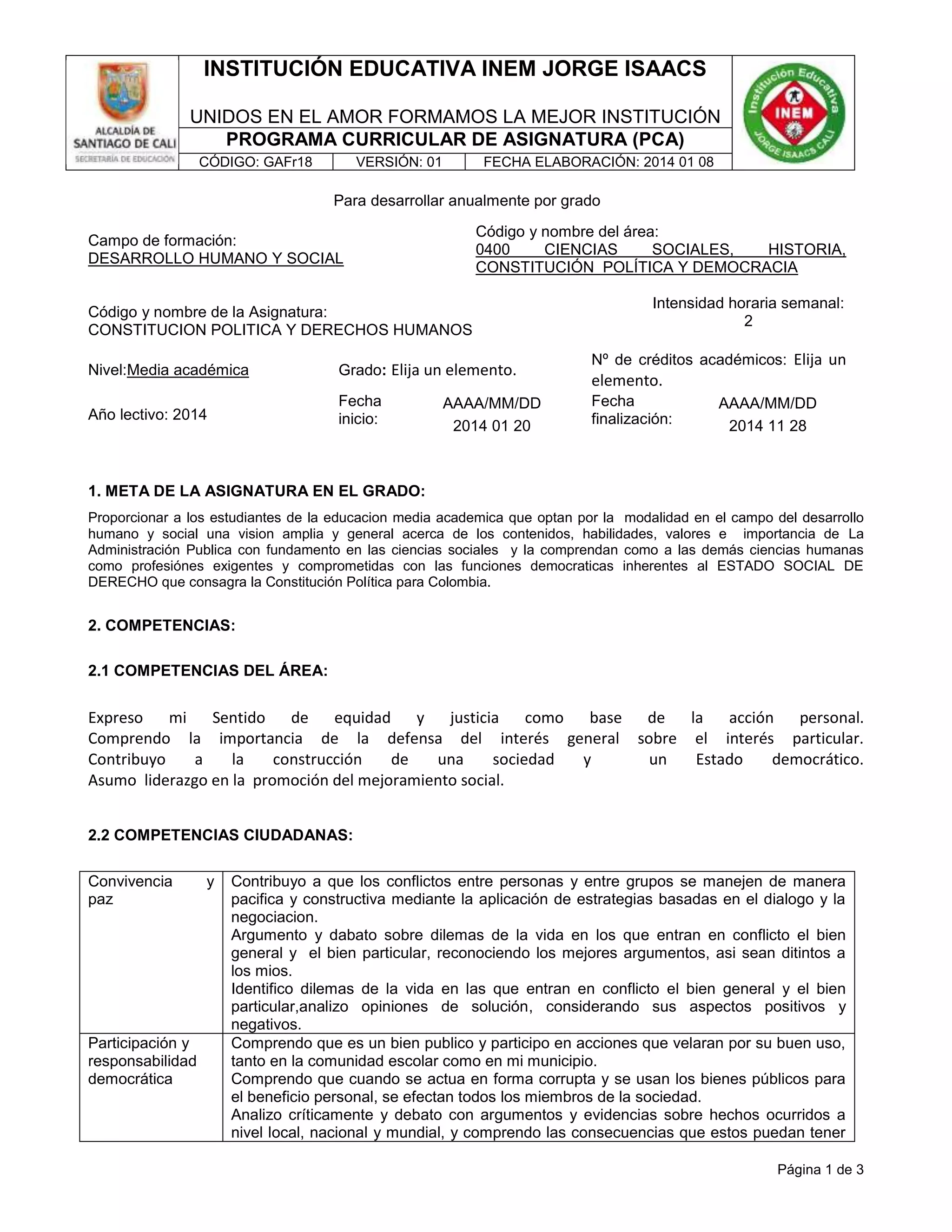Este documento presenta el programa curricular de la asignatura de Constitución Política y Derechos Humanos para un grado de educación media en Colombia. El programa describe los objetivos, competencias, contextos de aprendizaje, metodología, criterios de evaluación y recursos para la asignatura con el fin de proporcionar a los estudiantes una visión de los contenidos, habilidades y valores relacionados con la Constitución Política colombiana y los derechos humanos.