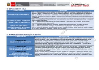 El documento describe un plan para fortalecer la educación física en una institución educativa con el objetivo de mejorar los aprendizajes y el comportamiento de los estudiantes. Se identifican problemas como indisciplina y falta de hábitos saludables, y se proponen actividades físicas que fomenten un estilo de vida activo y valores. Además, se establecen competencias y capacidades necesarias para el desarrollo integral de los alumnos en el contexto de la educación física.
