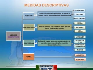 Este documento describe diferentes medidas descriptivas como cuartiles, deciles, percentiles, media, mediana, moda, varianza, desviación estándica, coeficiente de variación, rango, asimetría y curtosis. Explica cómo calcular e interpretar cada una de estas medidas para datos agrupados y no agrupados, y cómo indican valores centrales, dispersión y forma de una distribución de datos.