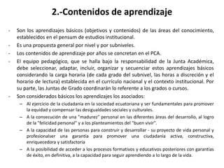 El documento describe los 10 componentes principales que debe incluir el Plan de Currículo Institucional (PCI) de una institución educativa. Estos componentes son: 1) enfoque pedagógico, 2) contenidos de aprendizaje, 3) metodología, 4) evaluación, 5) acompañamiento pedagógico, 6) acción tutorial, 7) planificación curricular, 8) proyectos escolares, 9) adaptaciones curriculares, y 10) planes de mejora. El PCI establece las directrices para implementar el currículo de acuerdo con