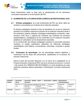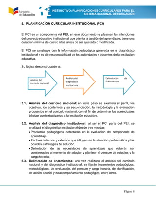 El documento describe los elementos esenciales de la Planificación Curricular Institucional (PCI) que cada institución educativa debe desarrollar. La PCI es un componente del Proyecto Educativo Institucional y contiene 10 elementos clave como el enfoque pedagógico, contenidos de aprendizaje, metodología, evaluación, acompañamiento pedagógico, acción tutorial y adaptaciones curriculares. Además, explica que la PCI tiene una duración mínima de 4 años y es responsabilidad de las autoridades y docentes de cada instituc