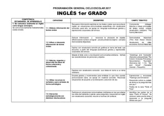 Este documento presenta la programación anual del área de Inglés de la Institución Educativa "San Francisco" en Conocancha, Perú. La programación incluye los objetivos generales y específicos del curso, así como las competencias, estándares de aprendizaje, capacidades, desempeños y campos temáticos que se abordarán para los grados primero a sexto. Los temas a cubrir incluyen vocabulario básico, gramática, comunicación oral y escrita en inglés.