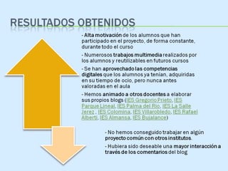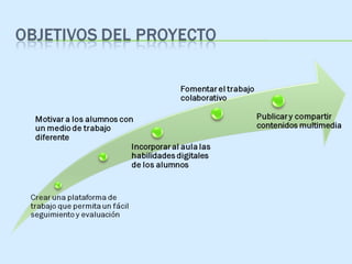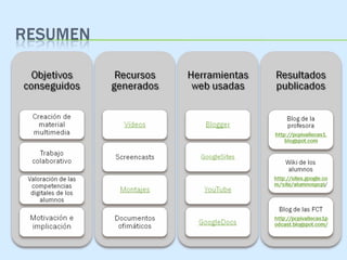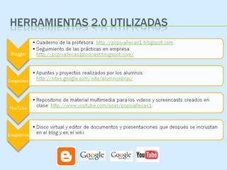 Este documento describe un proyecto educativo llamado PCPI 2.0 que traslada una clase a Internet sin libros de texto ni cuadernos. El proyecto utiliza herramientas web 2.0 como un blog de la profesora, un wiki de los alumnos y videos para motivar a alumnos que han fracasado con metodologías tradicionales. El objetivo es ofrecer recursos educativos y permitir a los alumnos publicar su trabajo utilizando Internet, su medio favorito.