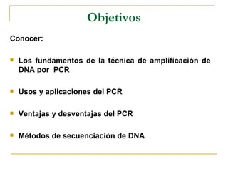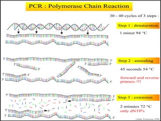 Este documento describe los fundamentos, pasos y aplicaciones de la reacción en cadena de la polimerasa (PCR), incluyendo la amplificación exponencial de ADN, los reactivos necesarios como cebadores, polimerasa y dNTPs, y los usos de PCR en análisis genéticos, investigación forense y medicina.