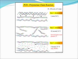 La reacción en cadena de la polimerasa (PCR) es un método para amplificar un fragmento específico de ADN. Involucra la desnaturalización del ADN, el apareamiento de cebadores y la extensión mediante una polimerasa. Se repiten estos pasos para lograr una amplificación exponencial del fragmento deseado. La PCR fue desarrollada por Kary Mullis en 1987 y ha revolucionado aplicaciones como el diagnóstico médico y la investigación genética.