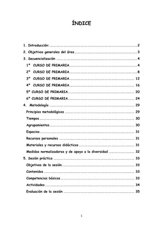 Este documento presenta una programación didáctica del área de educación física para primaria que incluye objetivos generales, contenidos específicos por curso, metodología y una sesión práctica de muestra. Los objetivos generales buscan el desarrollo motor, la salud, la expresión corporal y la participación en juegos y deportes de manera responsable e inclusiva. La programación detalla los contenidos por cada uno de los seis cursos de primaria y propone una metodología centrada en el alumno con diferentes