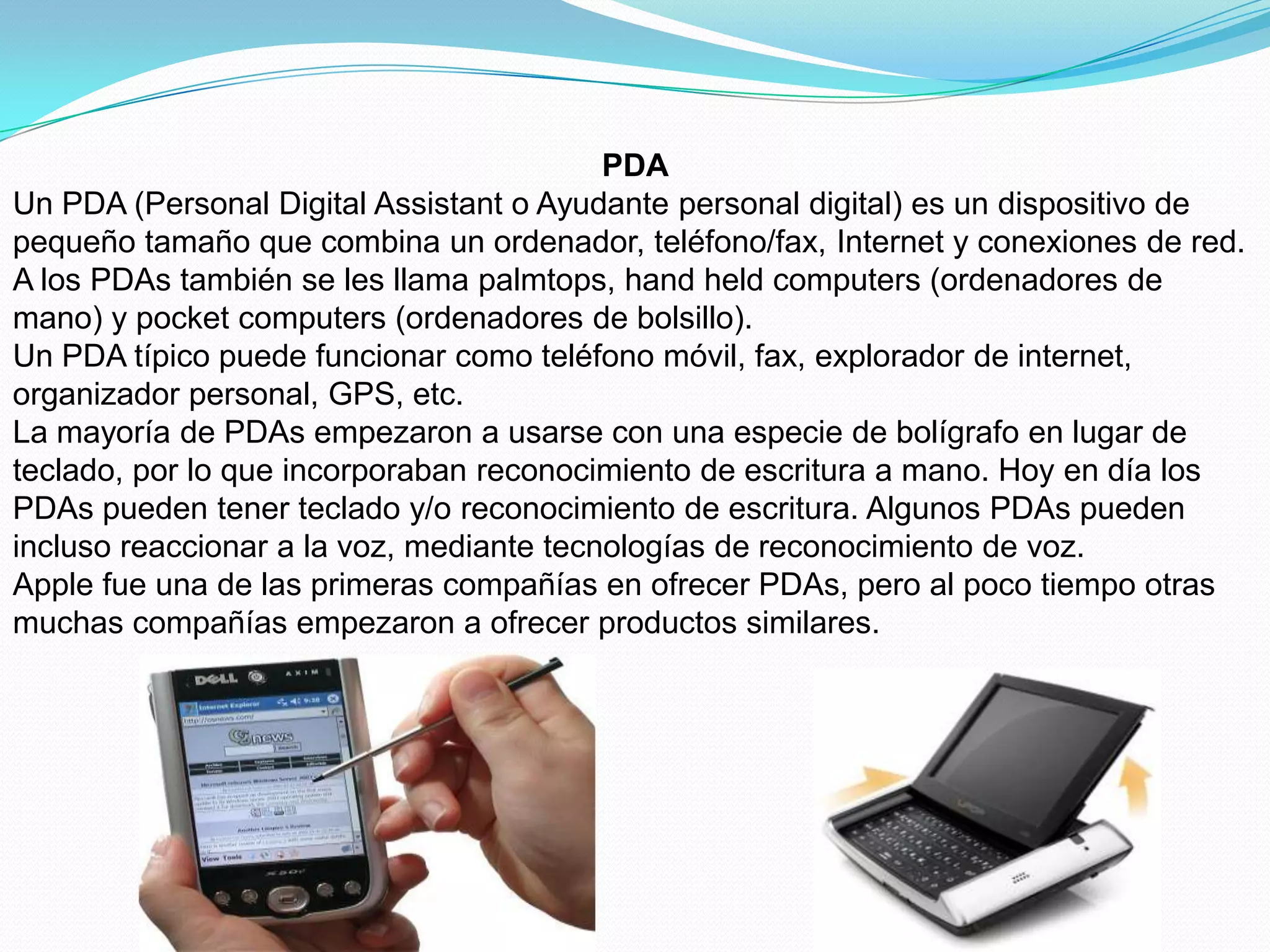 Este documento resume la historia y características de los ordenadores de bolsillo o asistentes digitales personales (PDA). Explica que los PDA combinan funciones de ordenador, teléfono, fax e internet en un dispositivo pequeño. Detalla que Apple lanzó uno de los primeros PDA en 1992 aunque no tuvo éxito, y que la compañía Palm popularizó estos dispositivos en 1995. Actualmente los PDA se usan principalmente para almacenar información como calendarios y contactos de forma portable, aunque los teléfonos intelig