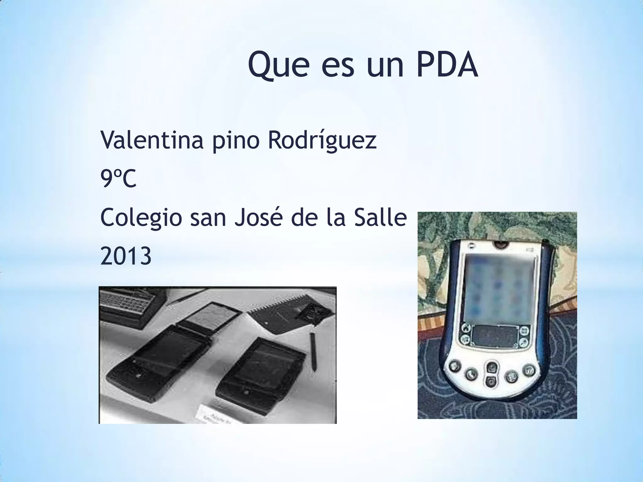 Un PDA (asistente digital personal) es un ordenador de mano originalmente diseñado como agenda electrónica con calendario, lista de contactos, bloc de notas y recordatorios. Los PDA modernos tienen pantallas táctiles, memoria, conectividad inalámbrica y soporte para correo electrónico y navegación web. Aunque los PDA son útiles para la organización, también tienen desventajas como costos elevados y posibilidad de daño.