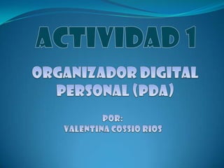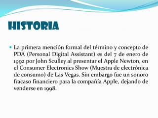 El documento describe la historia y características de los asistentes digitales personales (PDA). Menciona que el Apple Newton de 1992 fue el primer PDA formalmente presentado, aunque fracasó comercialmente. Actualmente, los teléfonos inteligentes han reemplazado en gran medida a los PDA al integrar sus funciones y más en un solo dispositivo móvil.