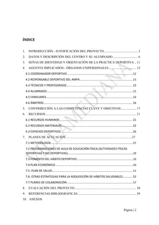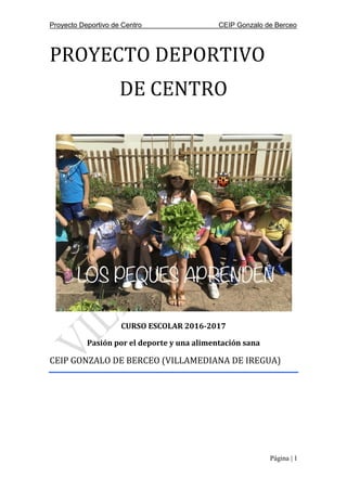 El documento presenta el proyecto deportivo del CEIP Gonzalo de Berceo para el curso 2016-2017, el cual busca fomentar hábitos saludables y la práctica de actividades deportivas entre su alumnado. Se describe la estructura del centro, la participación del alumnado en deportes, y los pilares que sustentan el proyecto, enfatizando la importancia de la actividad física para la salud y el rendimiento académico. Además, el proyecto se alinea con normativas educativas y busca la mejora continua, con la intención de ser reconocido como 'colegio deportivo'.