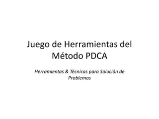 Este documento presenta una "caja de herramientas" de métodos y técnicas para apoyar el proceso PDCA (Planear, Hacer, Verificar, Actuar) de mejora continua. Describe el método PDCA de siete pasos y proporciona detalles sobre numerosas herramientas que pueden usarse en cada paso, como diagramas de causa y efecto, tormentas de ideas, diagramas de flujo y gráficos de control. El objetivo es brindar una guía de referencia para los equipos que usan el método PDCA para resolver problemas