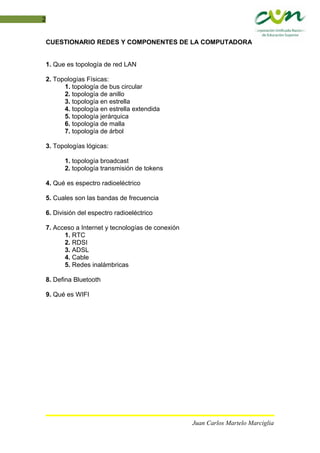 Este documento describe diferentes tipos de topologías de red, incluyendo topologías físicas como bus, anillo, estrella y jerárquica, y topologías lógicas como broadcast y transmisión de tokens. También explica el espectro radioeléctrico, las bandas de frecuencia y cómo se divide el espectro. Por último, detalla varias tecnologías para acceder a Internet como RTC, RDSI, ADSL, cable e inalámbricas.