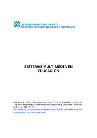 Este documento describe la evolución de los sistemas multimedia en educación, desde los primeros programas en soportes como videodiscos hasta el uso más reciente de CD-ROM y la web. Explica diferentes enfoques del aprendizaje con multimedia, como el aprendizaje basado en teorías asociacionistas, la construcción del conocimiento, y el aprendizaje contextual y en grupo. También analiza factores como la evaluación de programas multimedia y el papel del maestro como diseñador de contenidos.