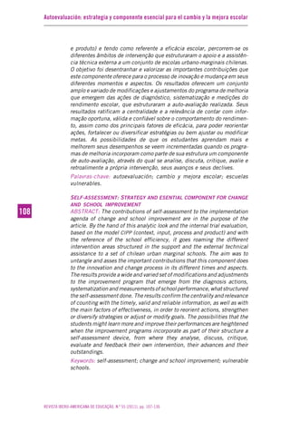 Este documento describe un programa de apoyo y asistencia técnica para mejorar escuelas vulnerables en Chile. El programa se enfocó en gestión educativa, prácticas pedagógicas y participación de familias. Incluyó un componente de autoevaluación para analizar los resultados e impactos y ajustar estrategias. La autoevaluación mostró que es una estrategia esencial para el cambio escolar, al permitir modificaciones basadas en diagnósticos, mediciones del rendimiento escolar. Su información válida y oportuna permite