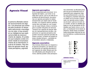 El documento describe la agnosia visual, un trastorno adquirido por daño cerebral en el que la persona afectada no puede reconocer estímulos visuales a pesar de tener visión parcialmente intacta. Existen dos tipos de agnosia visual: agnosia perceptiva, en la que la persona no puede identificar objetos, y agnosia asociativa, en la que la persona puede ver objetos pero no puede categorizarlos o asociarlos con su función.