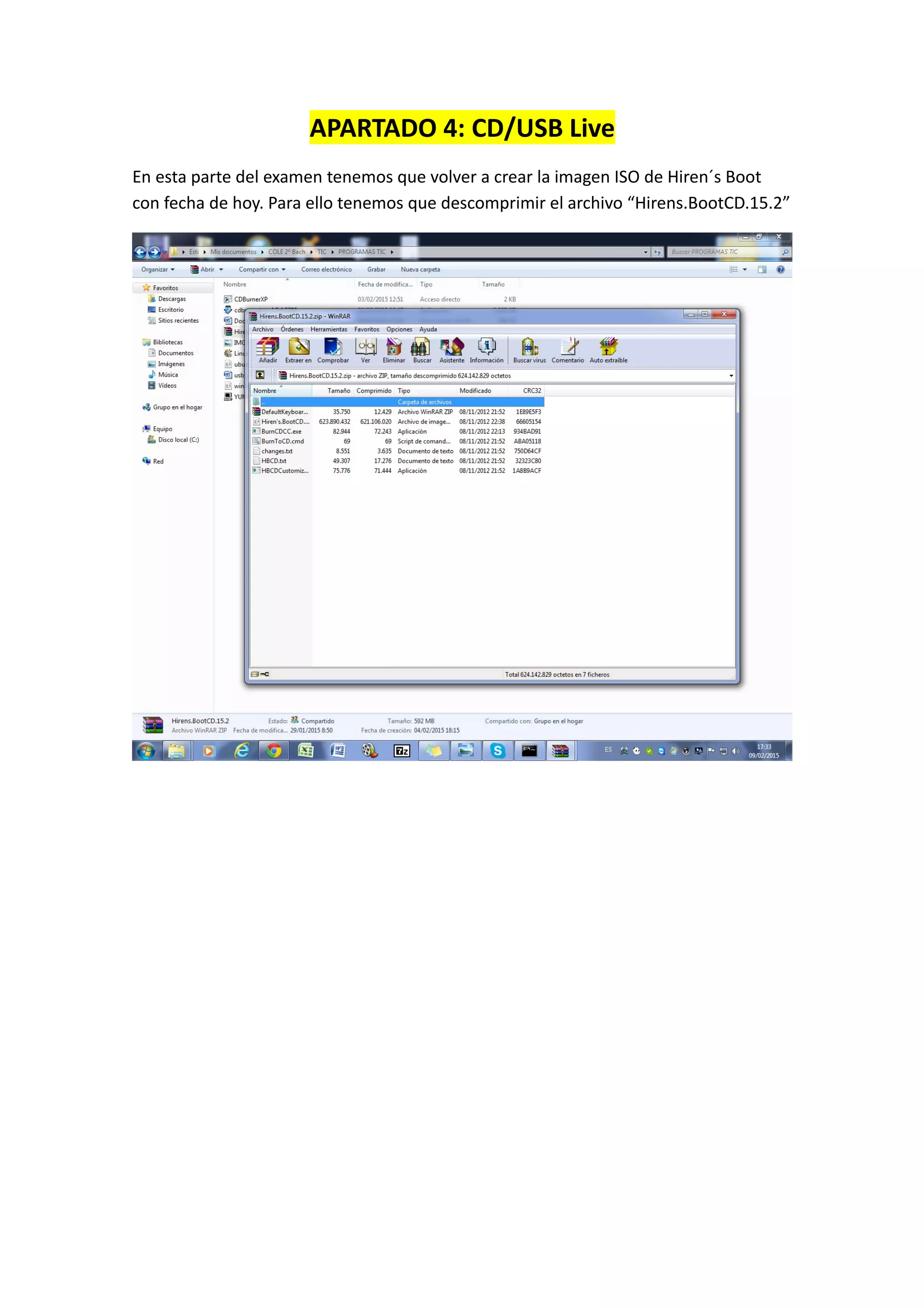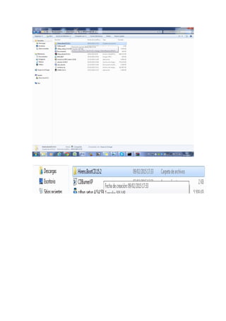 Este documento describe cómo crear una imagen ISO actualizada de Hiren's Boot CD y copiarla a un USB para crear un disco de arranque USB. Primero se descomprime el archivo Hirens.BootCD para acceder a la carpeta con la fecha y hora actuales y luego se descomprime un archivo adicional para configurar el teclado en español. Finalmente, el programa YUMI se usa para copiar la imagen ISO de Hiren's Boot CD a un USB, creando así un disco de arranque USB listo para usar.