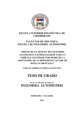 Este documento presenta una tesis de grado para optar el título de Ingeniera Automotriz. Propone el diseño e implementación de un sistema de encendido automático e inmovilizador para un vehículo estándar, mediante la adaptación de un dispositivo lector de huellas digitales. Describe los componentes del sistema de encendido tradicional de un vehículo y los elementos electrónicos necesarios para el circuito propuesto. Explica el funcionamiento del sistema automático de encendido basado en la identificación de huellas digitales y presenta los
