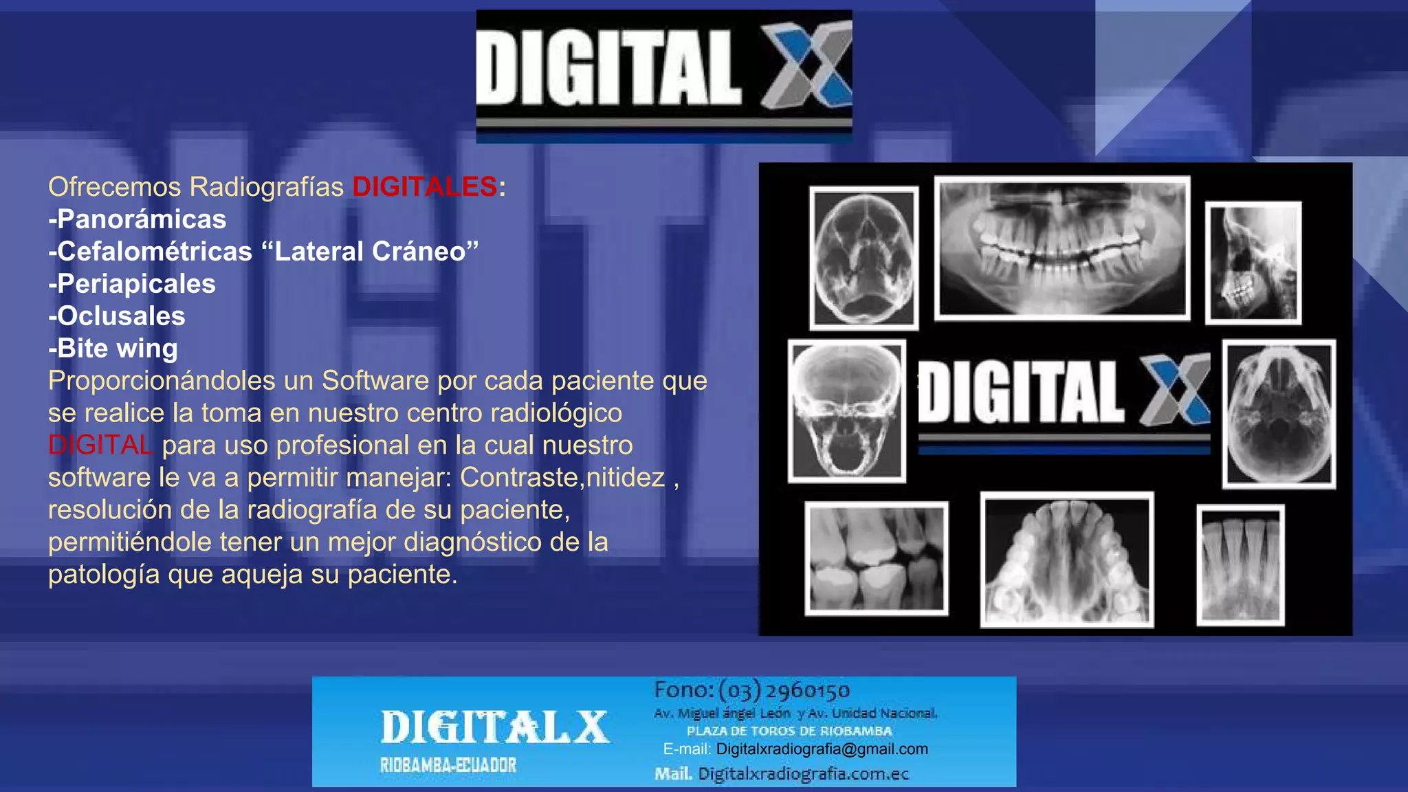 Ofrecemos varios tipos de radiografías digitales, incluyendo panorámicas, cefalométricas y periapicales. Cada paciente recibirá software para que los profesionales puedan ajustar el contraste, nitidez y resolución de las radiografías con el fin de obtener un mejor diagnóstico.