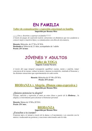 El documento presenta la programación de talleres y actividades para niños, jóvenes y adultos del centro El Árbol Doble durante la temporada 2013-2014. Ofrece diversos talleres de teatro, yoga, comunicación emocional, biodanza, clown, risoterapia y autoconocimiento, con diferentes horarios y precios. Además, anuncia charlas, conferencias y eventos familiares mensuales relacionados con el bienestar.