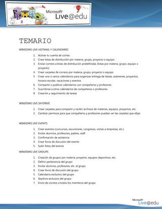Este documento presenta las principales funciones de los servicios de Microsoft Windows Live para estudiantes, incluyendo Hotmail y Calendar para organizar correo y eventos; SkyDrive para almacenar y compartir archivos; Groups para crear grupos de trabajo; y Workspaces para colaborar en documentos.