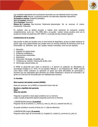 El Mini examen del estado mental (MMSE) es una prueba que evalúa la orientación, atención, memoria, capacidad de abstracción, lenguaje y percepción de un paciente para detectar demencia o delirium. Se aplica individualmente midiendo respuestas a preguntas sobre orientación temporal y espacial, registro de palabras, atención y cálculo, repetición de frases, comprensión y juicio. Un puntaje de 27 o más indica capacidad cognitiva normal, mientras que 24 o menos sugiere deterioro cognitivo.