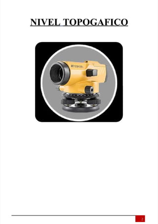 Este documento describe los diferentes tipos de niveles topográficos, incluyendo niveles de plano, de línea, de línea de inclinación y automáticos. Explica que los niveles automáticos son los más comúnmente usados hoy en día debido a que mantienen la línea de colimación horizontal automáticamente sin necesidad de calibración adicional por el operador. También enumera las partes clave de un nivel topográfico como el anteojo, nivel de burbuja, tornillos niveladores y retículo
