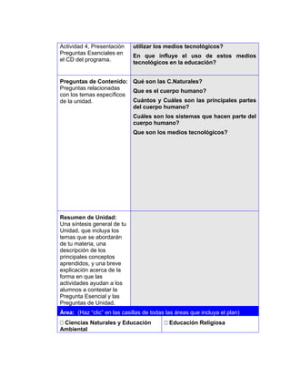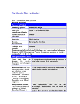 Este documento presenta una plantilla para el desarrollo de un plan de unidad educativa. Incluye secciones para proporcionar información sobre el autor, el título y preguntas esenciales de la unidad, áreas curriculares cubiertas, grados escolares, estándares, actividades planificadas, recursos requeridos, y adaptaciones para estudiantes con necesidades especiales. El objetivo es guiar el diseño de una unidad didáctica completa que aborde un tema de manera integral y promueva el aprendizaje significativo en los