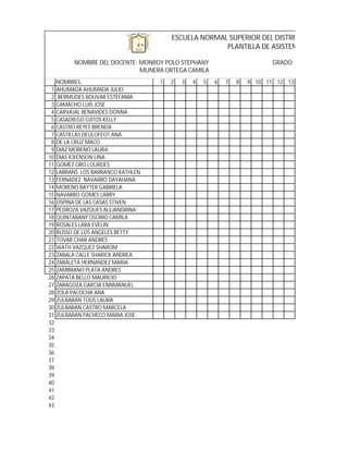 Este documento es una plantilla de asistencia de un grado 4o en la Escuela Normal Superior del Distrito de Barranquilla. Contiene los nombres de 31 estudiantes y las columnas para marcar su asistencia durante el mes de abril. La profesora a cargo es Stephany Monroy Polo.