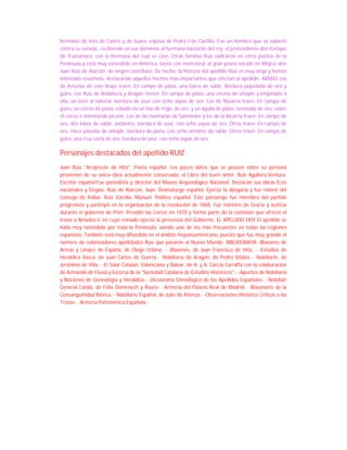 Este documento describe el origen y la historia del apellido Ruiz. Explica que es un apellido patronímico derivado del nombre propio Rui, que se usó con preferencia en Castilla. Menciona varios personajes históricos destacados con este apellido como el Cid Campeador, conquistadores en América y figuras políticas. También resume brevemente las armas heráldicas usadas por diferentes ramas de la familia Ruiz y concluye que aunque el apellido se extendió por toda España, sus orígenes son probablemente castellanos.