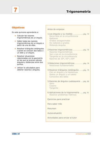 Este documento presenta un capítulo sobre trigonometría. Introduce conceptos como ángulos y su medida en radianes y grados, razones trigonométricas como seno, coseno y tangente, y cómo calcular estas razones para ángulos específicos como 30°, 45° y 60°. También explica cómo resolver triángulos rectángulos y aplicar la trigonometría a problemas métricos usando una calculadora. El objetivo es que los estudiantes aprendan a calcular razones trigonométricas, hallar todas las razones a partir de
