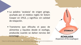 La acalasia es un trastorno neuromuscular raro que dificulta el paso de alimentos desde el esófago al estómago. Se produce por daño nervioso que impide la relajación del esfínter esofágico inferior. Sus síntomas incluyen dificultad para tragar y regurgitación de alimentos. El diagnóstico se realiza mediante endoscopia, esofagograma y manometría esofágica. Los tratamientos buscan reducir la presión del esfínter e incluyen dilatación endoscóp