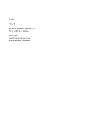El resumen analiza los datos de una tabla que clasifica compañías por tamaño y porcentaje de su fuerza laboral empleada. La tabla muestra los valores observados y esperados en 8 categorías. Se calcula el estadístico Ji cuadrada y se concluye que la distribución de la fuerza laboral es igual entre compañías pequeñas y grandes, ya que el P-valor se encuentra entre 0.90 y 0.10.