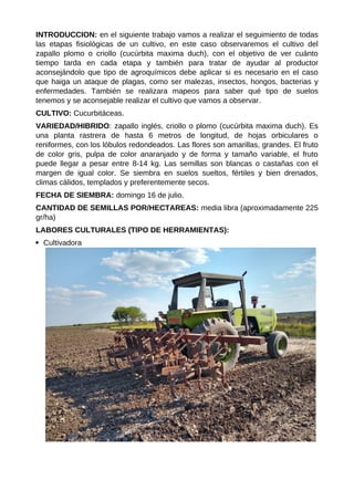 El documento detalla el seguimiento del cultivo de zapallo plomo (Cucurbita maxima) durante su ciclo de crecimiento, desde la siembra hasta la cosecha, subrayando la importancia de monitorear plagas y condiciones del suelo. A pesar de los esfuerzos en la gestión del cultivo, se reportó una menor cosecha de 4 toneladas/ha debido a condiciones climáticas adversas y la invasión de malezas. Se concluye que la producción agrícola requiere un conocimiento profundo sobre el suelo y el clima, además de una adecuada inversión en agroquímicos para alcanzar los rendimientos esperados.