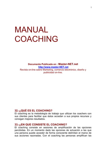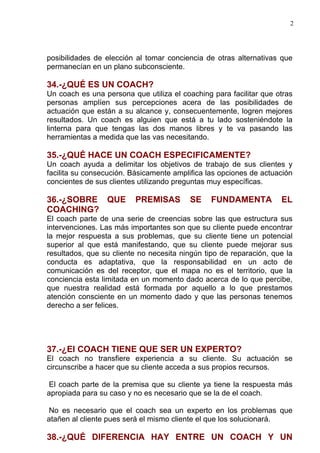 El documento proporciona información sobre el coaching. Explica que el coaching consiste en sesiones que amplían las opciones de actuación percibidas por un cliente para que pueda lograr mejores resultados. Un coach utiliza preguntas para ayudar a los clientes a delimitar objetivos y ampliar sus opciones de manera conciente. El coaching se basa en la premisa de que el cliente ya tiene la respuesta más apropiada dentro de sí mismo.