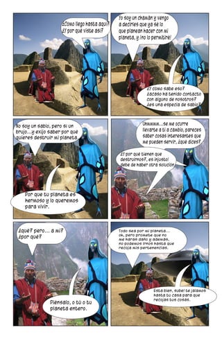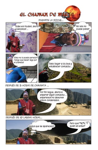 Este documento presenta los créditos de una fotonovela titulada "El chaman". Incluye el título del capítulo 1 "la llegada", los detalles de producción como el año, número, ubicación y mes de publicación. También enumera los créditos de la guionista, directora, fotógrafa y los personajes de la fotonovela.