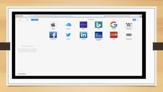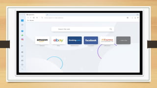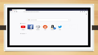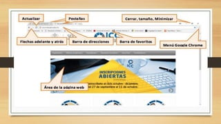 El documento habla sobre navegadores web. Explica que un navegador permite acceder a Internet interpretando sitios web para mostrarlos al usuario. Luego describe características comunes como pestañas y marcadores. Finalmente, detalla algunos navegadores populares como Internet Explorer, Firefox, Safari, Opera y Google Chrome.