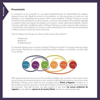 El documento presenta un seminario sobre design thinking como metodología de innovación crucial para la sostenibilidad empresarial. Se explorarán sus etapas clave: inspiración, ideación e implementación, y se aplicarán en un taller práctico de rediseño de productos. El evento está dirigido a profesionales relacionados con la innovación y el desarrollo de negocio, y se llevará a cabo el 30 de septiembre de 2014 en Oviedo.