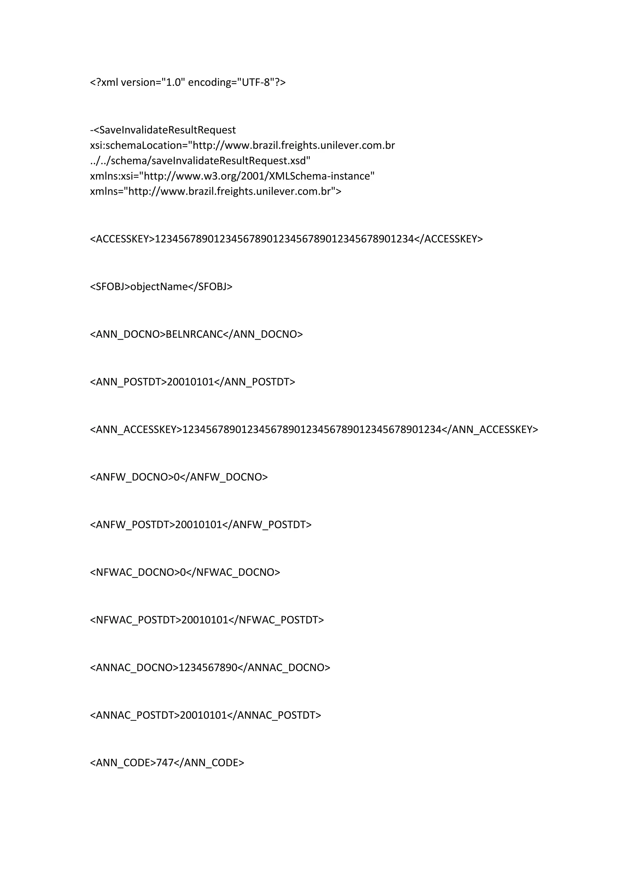 Este documento XML contiene información sobre una solicitud de guardar e invalidar resultados, incluyendo un identificador de acceso, nombre de objeto, números y fechas de documentos de anulación, confirmación y registro, así como un código y fecha de anulación. También incluye un registro de actividad con un código alternativo, número de mensaje y texto del mensaje.