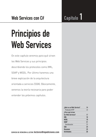Este documento introduce los conceptos básicos de los servicios web, incluyendo qué son los servicios web, para qué sirven, y los protocolos y tecnologías subyacentes como XML, SOAP, WSDL y SOA. Explica brevemente cada uno de estos conceptos y protocolos y cómo se relacionan entre sí para permitir la comunicación entre aplicaciones de forma multiplataforma y multiidioma a través de Internet.