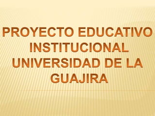 Este documento resume el proyecto educativo institucional de la Universidad de La Guajira. Explica que la universidad desarrolló un plan estratégico en 2014 llamado Academia de Proyección Social tras definir su visión de futuro "Macuira Encantada". También analiza el contexto de la educación superior en Colombia, la región Caribe y el departamento de La Guajira para diseñar su plan estratégico.